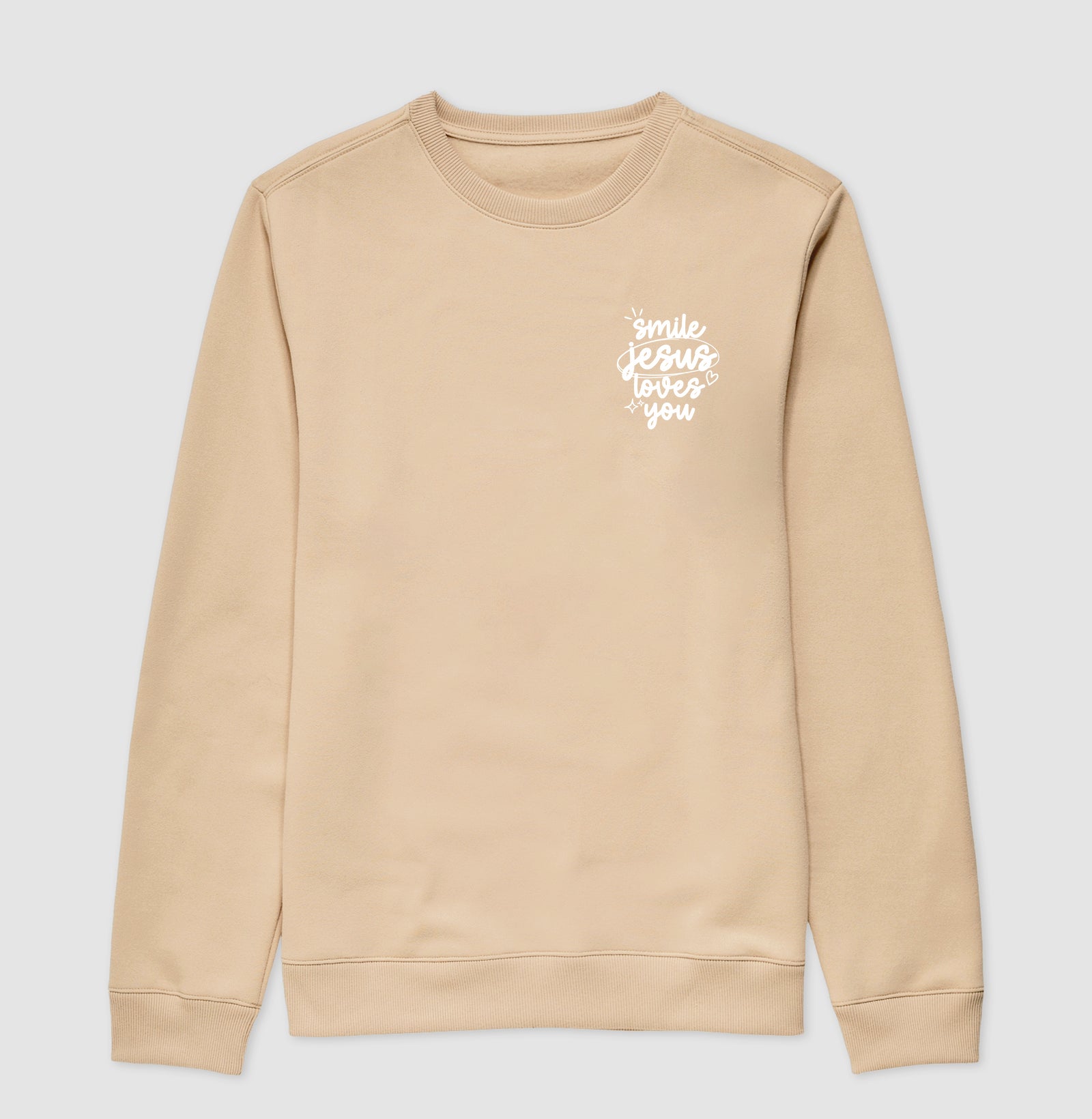Com um toque leve e feminino, este moletom clássico traz a mensagem “Smile, Jesus loves you” em uma tipografia manuscrita encantadora, perfeita para iluminar os dias com fé e alegria. Uma peça que mistura delicadeza com propósito, ideal para quem deseja espalhar amor por onde passa. Vista sua fé com estilo, conforto e um sorriso no rosto!